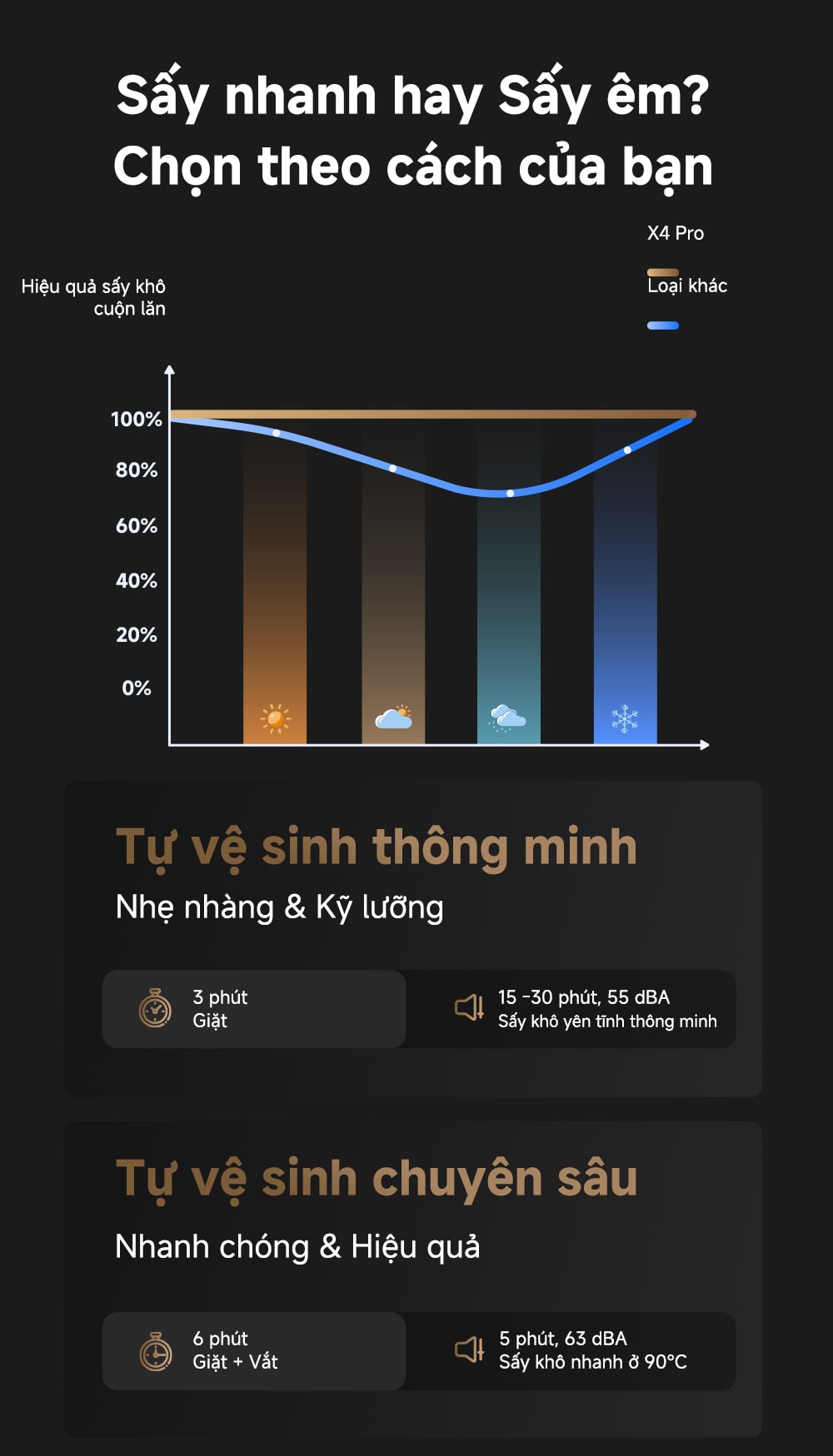 Tự sấy khô 90°C (194°F): Với hai chế độ sấy (Sấy yên tĩnh thông minh và Sấy nhanh), cuộn lăn luôn khô ráo, ngăn ngừa nấm mốc và mùi hôi. Chế độ sấy thông minh tự động điều chỉnh thời gian sấy (15-30 phút) với độ ồn thấp (55dBA).