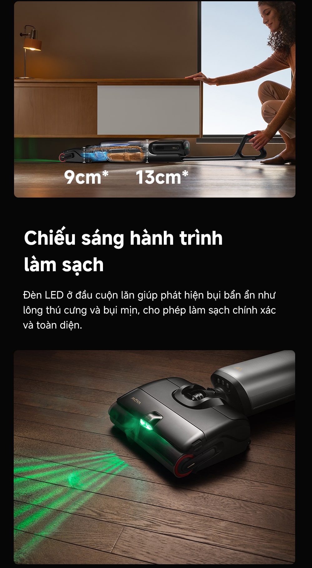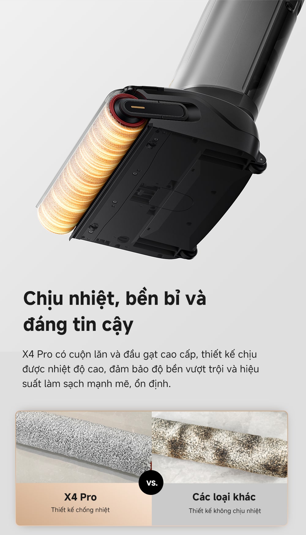 Với lực hút mạnh mẽ lên đến 20.000Pa và động cơ tốc độ cao 104.000 vòng/phút, X4 Pro dễ dàng xử lý cả bụi khô và ướt, thậm chí là những bụi bẩn bám sâu. Thiết kế ngả phẳng 180° (đầu cuộn lăn chỉ 9cm khi ngả) giúp tiếp cận mọi ngóc ngách, khe hẹp dưới đồ nội thất. Đầu cuộn lăn có đèn LED chiếu sáng giúp bạn không bỏ sót bất kỳ bụi bẩn nào.