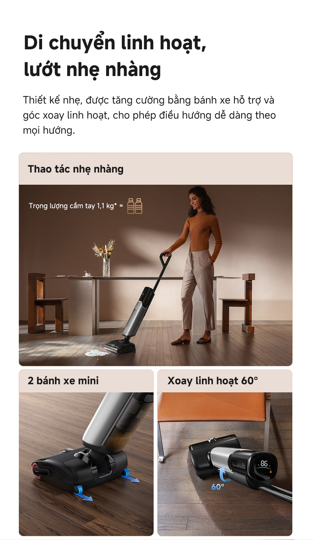 Trọng lượng tay cầm nhẹ chỉ 1.1kg và bánh xe mini đa hướng, xoay 60° giúp di chuyển linh hoạt và dễ dàng quanh đồ nội thất.