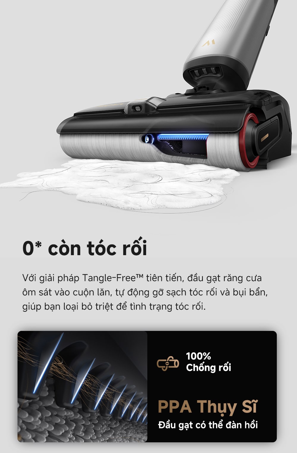 Không còn nỗi lo tóc rối nhờ đầu gạt răng cưa ôm sát cuộn lăn, tự động gỡ sạch tóc và bụi bẩn. X4 Pro đã được TÜV Rheinland chứng nhận không bị rối tóc ngay cả với 1.000 sợi tóc ướt dài 50cm.
