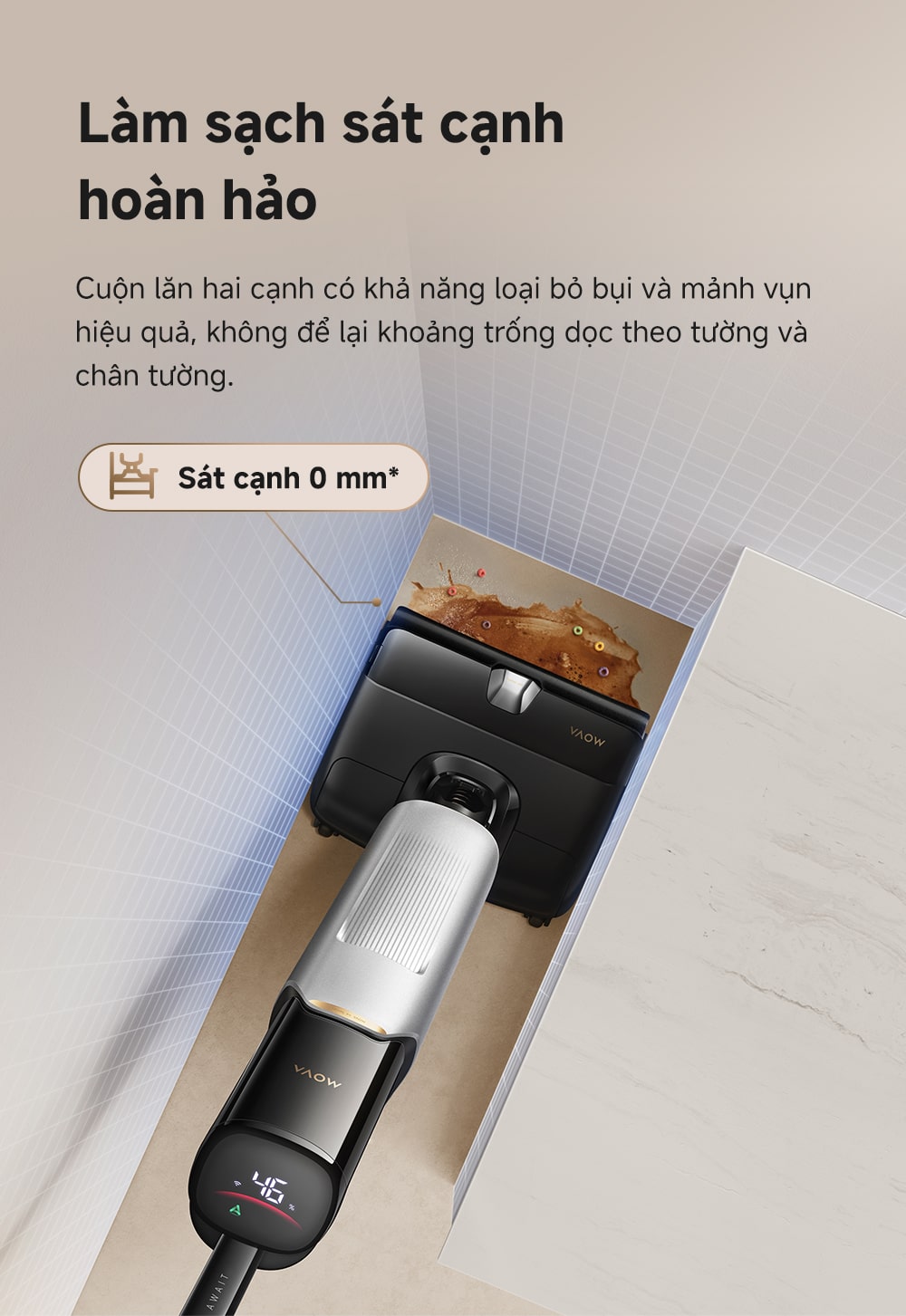 Cuộn lăn tràn viền 2 bên đảm bảo làm sạch hoàn hảo dọc theo tường và ván chân tường, không để lại khoảng trống 0mm.