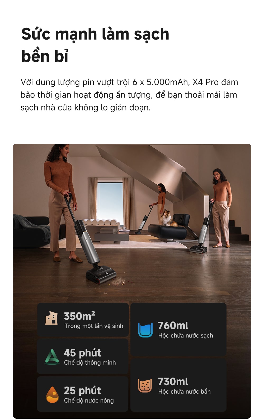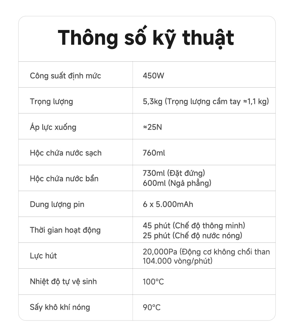 Thời gian hoạt động lên đến 45 phút ở chế độ thông minh và 25 phút ở chế độ nước nóng, cho phép làm sạch diện tích lớn đến 350m² chỉ với một lần sạc.