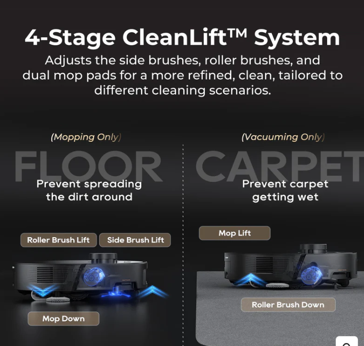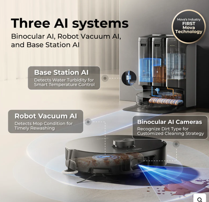 Hệ thống AI thông minh: Bao gồm Binocular AI (camera nhận diện bẩn), Robot Vacuum AI và Base Station AI, giúp điều chỉnh chiến lược làm sạch theo thời gian thực.
