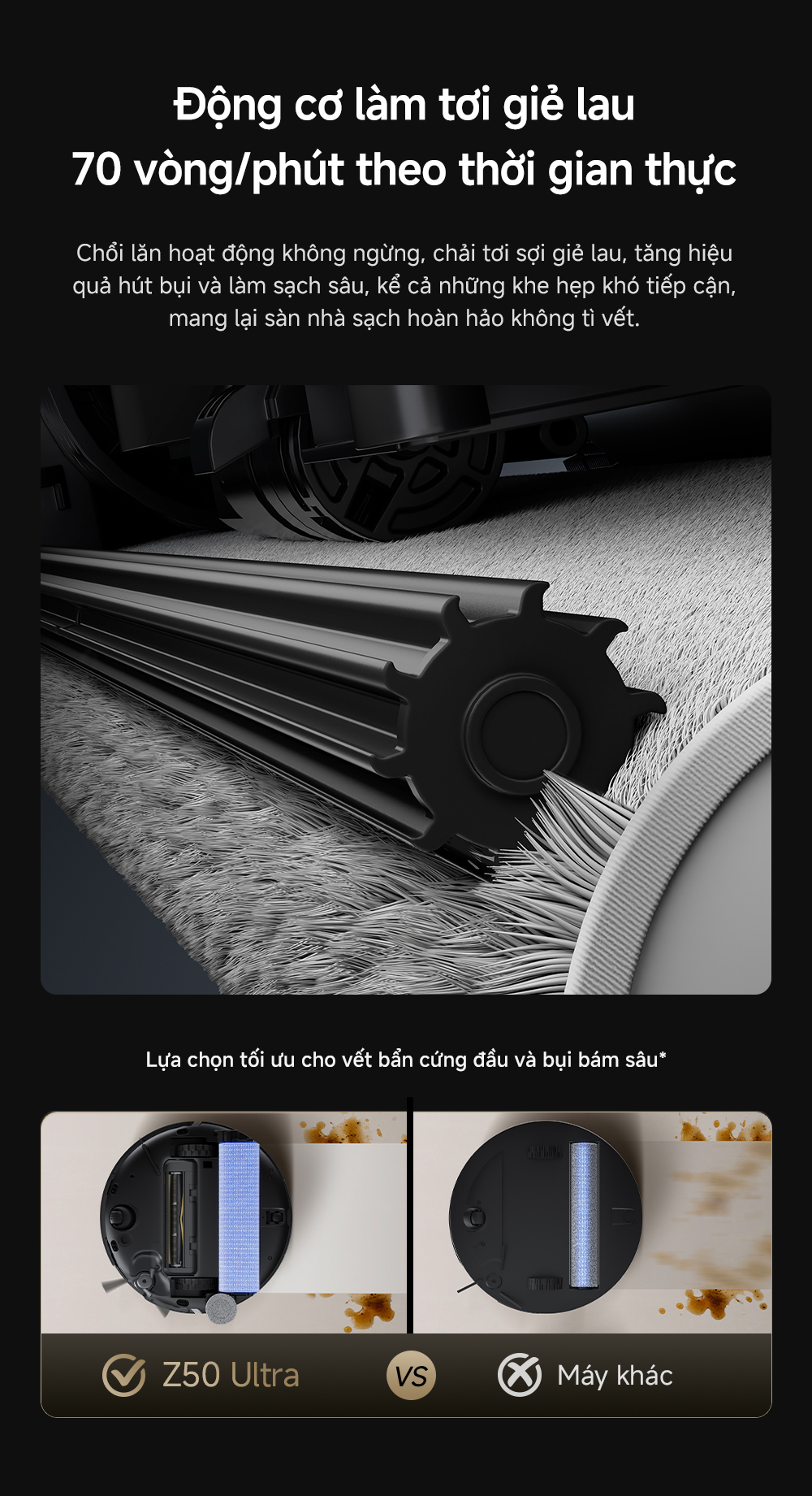 Làm tơi: Chổi lăn làm tơi các sợi giẻ lau theo thời gian thực, duy trì khả năng hấp thụ bụi bẩn tối ưu.