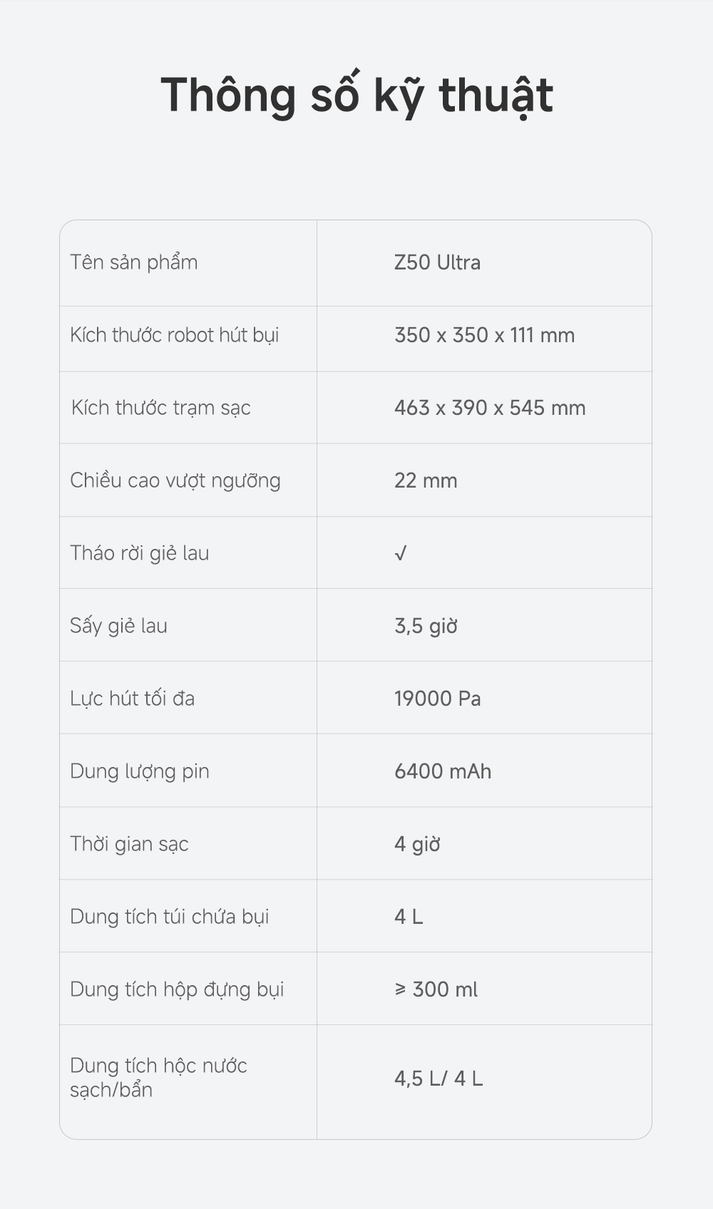 Dreame MOVA Z50 Ultra là mẫu robot hút bụi lau nhà đa năng thế hệ mới, tích hợp hàng loạt công nghệ đột phá, mang đến trải nghiệm làm sạch tối ưu và hoàn toàn tự động. Sản phẩm phù hợp cho mọi không gian, đặc biệt là những căn hộ, nhà phố hoặc biệt thự có diện tích lớn.