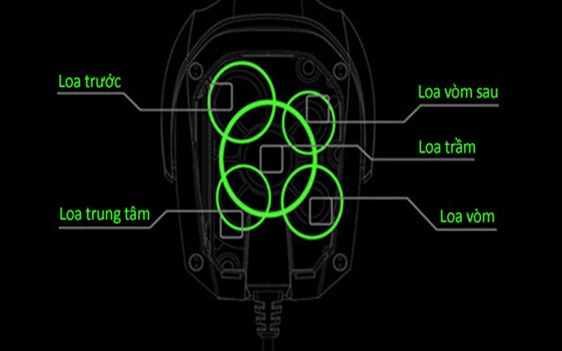 Âm thanh vòm 5.1 với 4 loa trong một bên tai lần lượt đảm nhiệm các loa bên trái, loa bên phải, loa chính giữa và loa siêu trầm (thường ẩn phía trong).