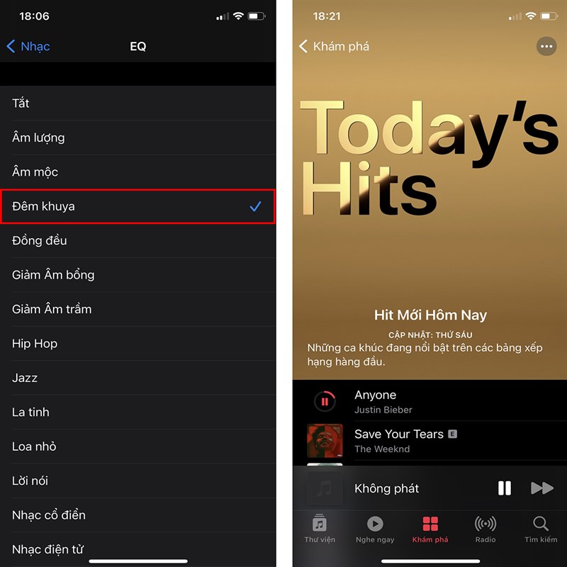 Trong mục EQ, bạn chọn Đêm khuya. Giờ đây, âm lượng trên iPhone của bạn sẽ to hơn 20%.
