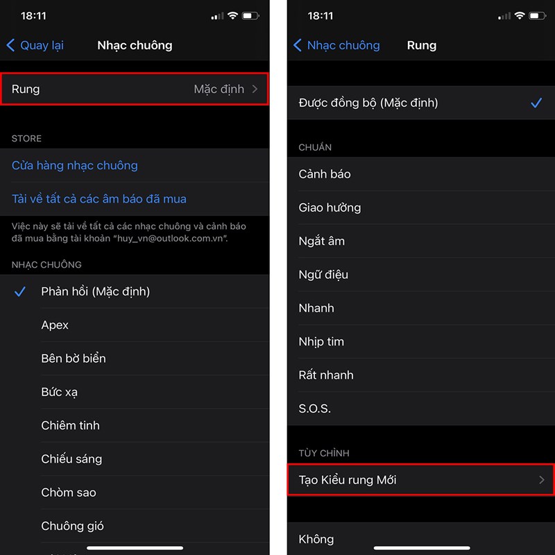 Tiếp theo, bạn chọn Rung, cuộn xuống mục Tùy chỉnh và chọn Tạo Kiểu rung Mới.
