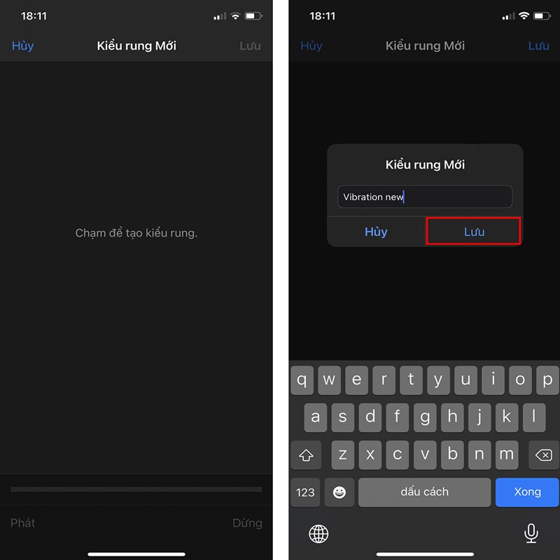 Cuối cùng, bạn chạm vào màn hình để tạo kiểu rung mới. Sau đó đặt tên và nhấn Lưu. Giờ đây bạn có thể đặt kiểu rung mới cho các liên lạc của mình.