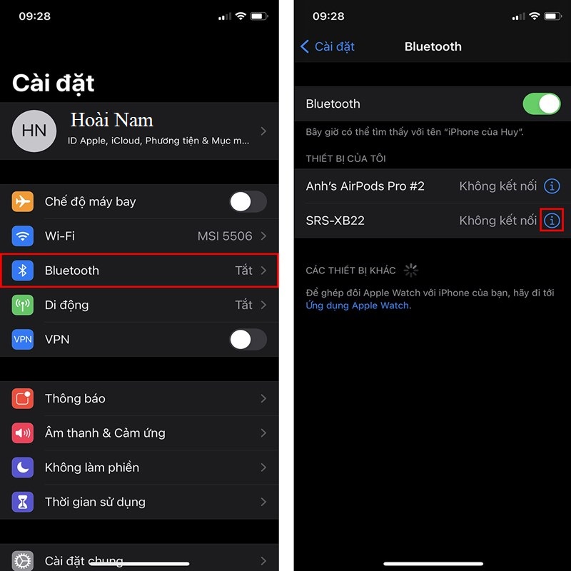 Bước 1. Vào Cài đặt > Bluetooth > nhấn chữ i tại tên thiết bị Bluetooth.