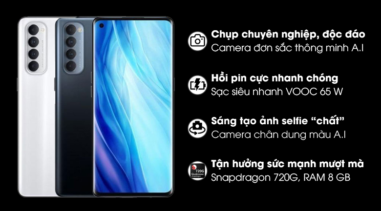 Mới đây, OPPO đã chính thức trình làng chiếc smartphone mới mang tên OPPO Reno4 Pro. Máy được trang bị cấu hình vô cùng cao cấp với vi xử lý chip Snapdragon 720G, bộ 4 camera đến 48 MP ấn tượng, cùng công nghệ sạc siêu nhanh Super VOOC 65 W hướng tới nhóm khách hàng thích chụp ảnh, chơi game với hiệu năng cao nhưng được bán với mức giá vô cùng tốt.