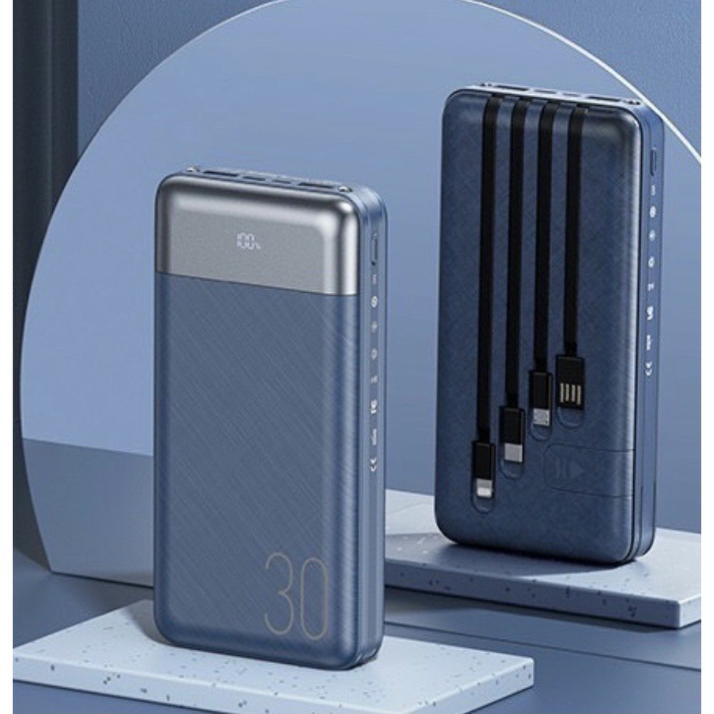 Điều thú vị cục pin sạc dự phòng 30000mAh này tích hợp đến 4 dây cáp sạc đi kèm ở mặt sau của pin: