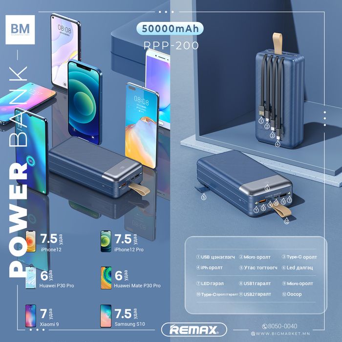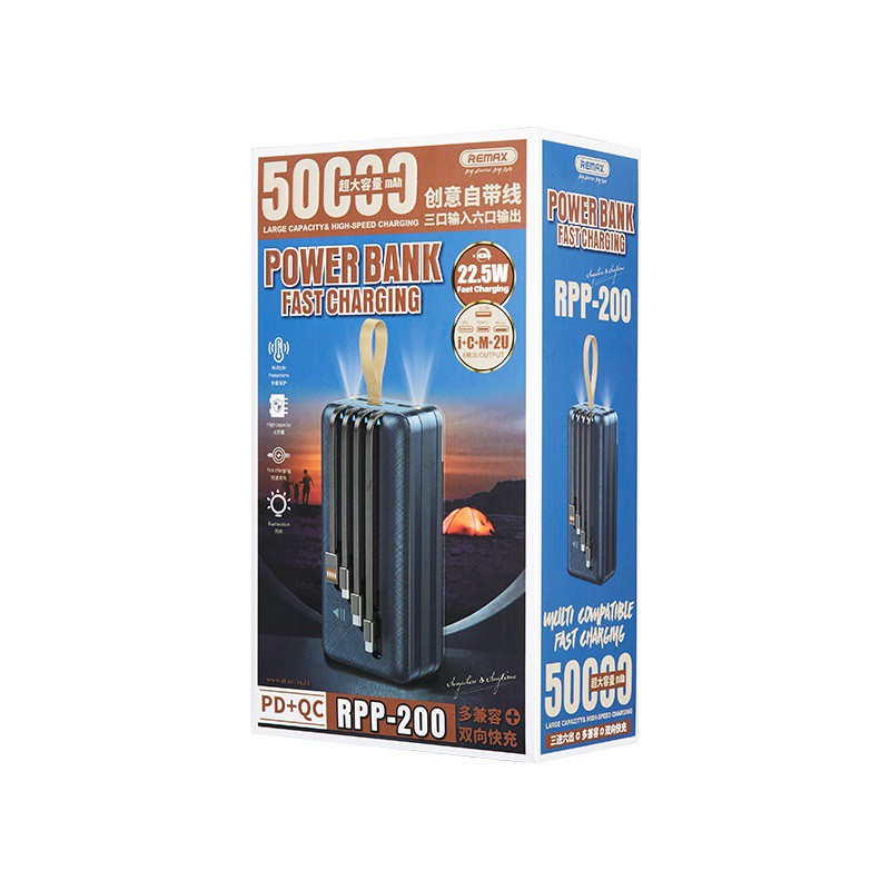 Pin sạc dự phòng Remax RPP-200 sử dụng lõi pin polymer siêu bền với dung lượng khủng đến 50000mAh, chính vì vậy người dùng có thể thoải mái mang theo bên cạnh để cung cấp năng lượng cho mọi thiết bị của mình. Đặc biệt các hỗ trợ công nghệ sạc nhanh như QUICK CHARGE 3.0 20W, Super Charge 22.5W, PD 20W, giúp tiết kiệm thời gian sạc cho tất cả các dòng điện thoại có hỗ trợ sạc nhanh từ Android đến iOS.