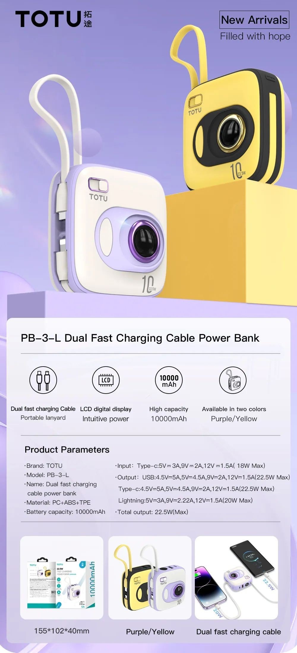 Việc sở hữu một chiếc pin sạc dự phòng là một điều vô cùng cần thiết cho những ai thường xuyên học tập và làm việc ở môi trường bên ngoài. Totu PC-3L là sản phẩm pin sạc với thiết kế kiểu dáng máy ảnh độc đáo sang trọng. Kèm theo đó là khả năng sạc nhanh hai chiều với công suất lên đến 22.5W ( Max). Dung lượng pin 10000mAh đáp ứng nhu cầu sạc các thiết bị nhiều lần trong ngày. Với những ưu điểm này , đây chắc chắn là lựa chọn hoàn hảo dành cho những ai đang tìm kiếm một chiếc sạc dự phòng phù hợp.
