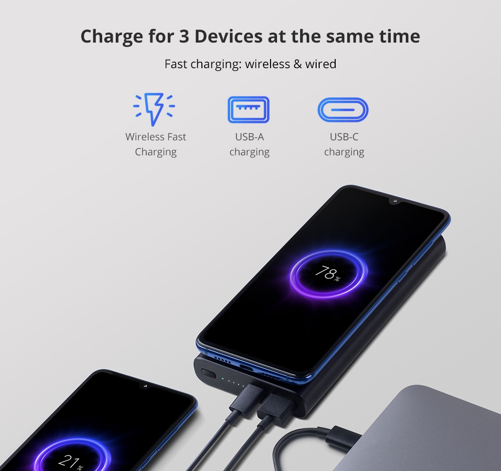 Bên cạnh đó Pin sạc dự phòng Xiaomi WPB15ZM còn được trang bị đầu ra USB-A với công suất lên tới 18W MAX, hỗ trợ sạc các thiết bị như điện thoại di động, máy ảnh, máy chơi game, máy tính bảng,... Người dùng cũng có thể sử dụng đồng thời tính năng sạc không dây và có dây cùng lúc, lúc này công suất sạc có thể đạt tối đa là 15W, giúp tiết kiệm thời gian hơn.
