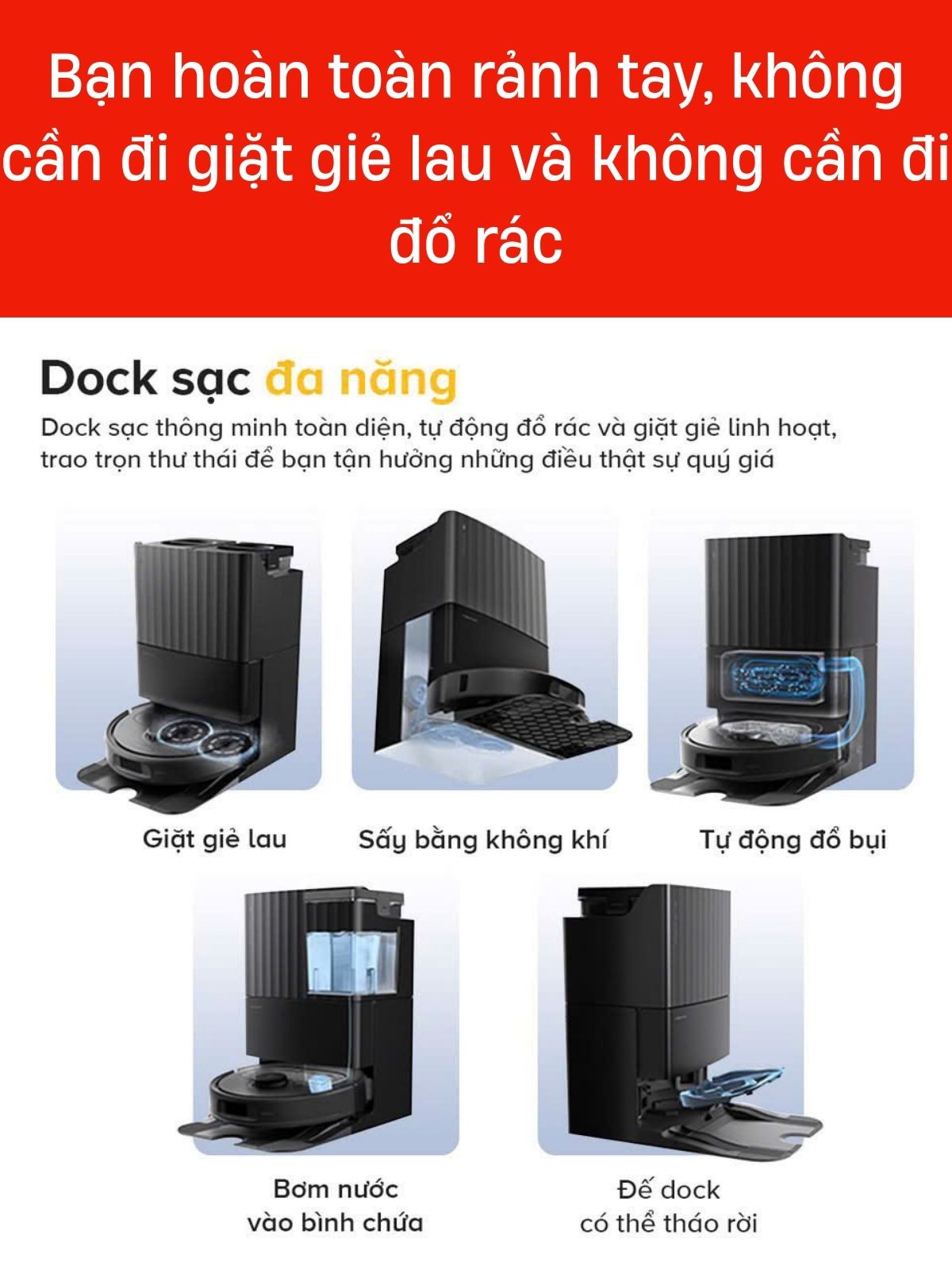 ✅-Trạm sạc đa năng: Tự động đổ rác, giặt và sấy khô giẻ lau, bơm nước vào bình chứa, giúp giảm thiểu thao tác thủ công và tối ưu thời gian dọn dẹp