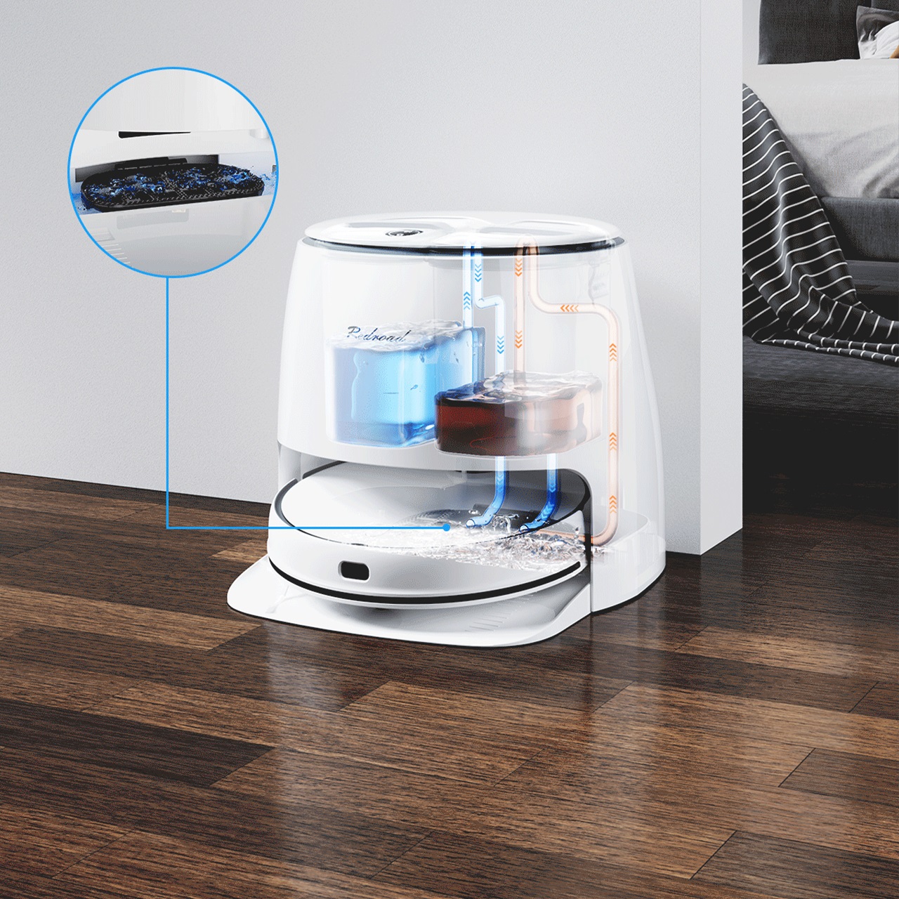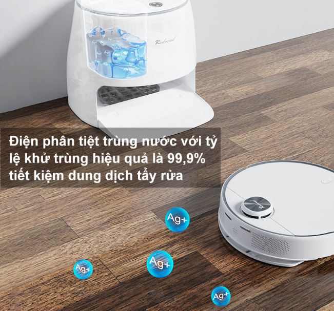 Robot hút bụi lau nhà Redroad G10 sau khi hoàn thành công việc và quay trở lại trạm của nó, khăn lau của nó được rửa sạch bằng nước khử trùng, điện khí hóa. Chỉ với một nút chạm, phần nước sạch trong khay chứa nước sẽ được điện phân thành nước tiệt trùng với tỷ lệ khử trùng hiệu quả là 99,9% mà không cần dùng dung dịch tẩy rửa, không gây ô nhiễm, không mùi khó chịu, an toàn và thân thiện với môi trường, chăm sóc cho người già và trẻ nhỏ. Quá trình này không chỉ đảm bảo rằng thiết bị sạch sẽ và sẵn sàng cho lần vệ sinh tiếp theo mà còn ngăn ngừa nấm mốc và loại trừ khả năng phát triển của vi khuẩn.