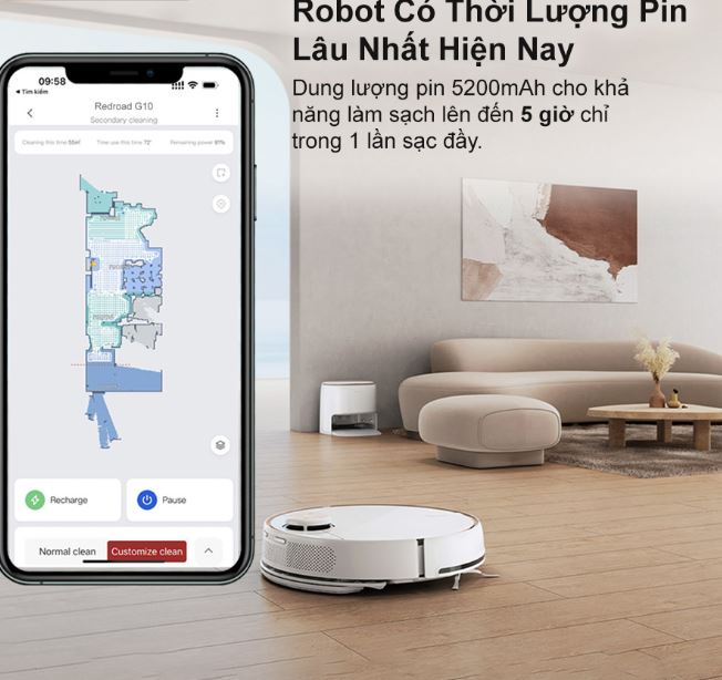 Robot hút bụi lau nhà Redroad G10 nổi bật với viên pin 5200 mAh cho thời lượng sử dụng lâu dài, có thể làm sạch sàn với tổng diện tích bề mặt lên tới 300m2* ( Dựa theo thử nghiệm của nhà xuất). Redroad G10 tiêu thụ điện năng thấp, thời gian sạc chỉ mất khoảng 4 giờ đồng hồ, thân thiện với môi trường. Robot tự động quay về dock sạc khi pin yếu <20% hoặc khi hoàn thành việc làm sạch. Không quan trọng bạn có một căn hộ nhỏ hay một ngôi nhà rất lớn – Redroad G10 chắc chắn sẽ đáp ứng nhu cầu của bạn.