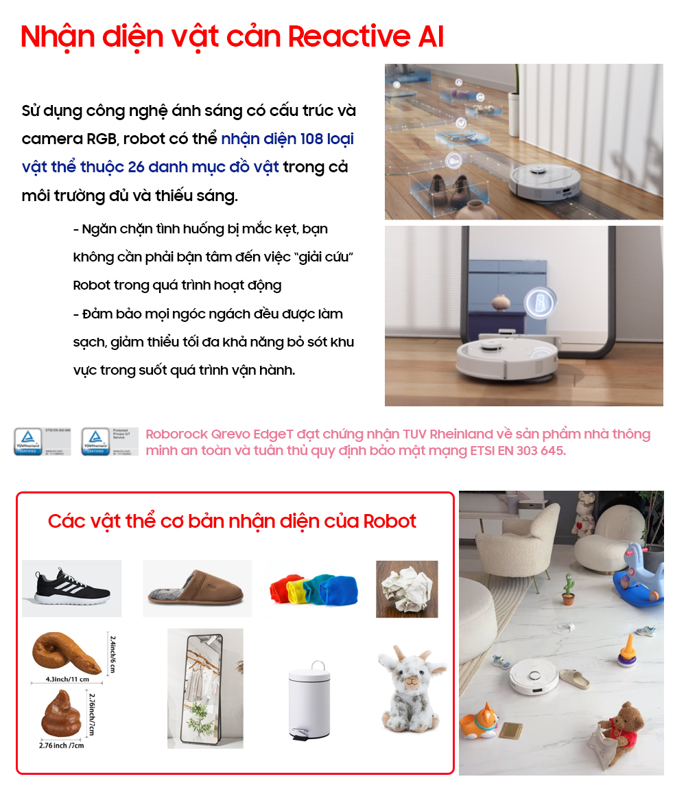 QRevo EdgeT trang bị công nghệ nhận diện vật cản thông minh nhất hiện nay Reactive AI. Giúp Robot di chuyển mượt mà, lập và xác định bản đồ, vật thể nhanh chóng và linh hoạt.