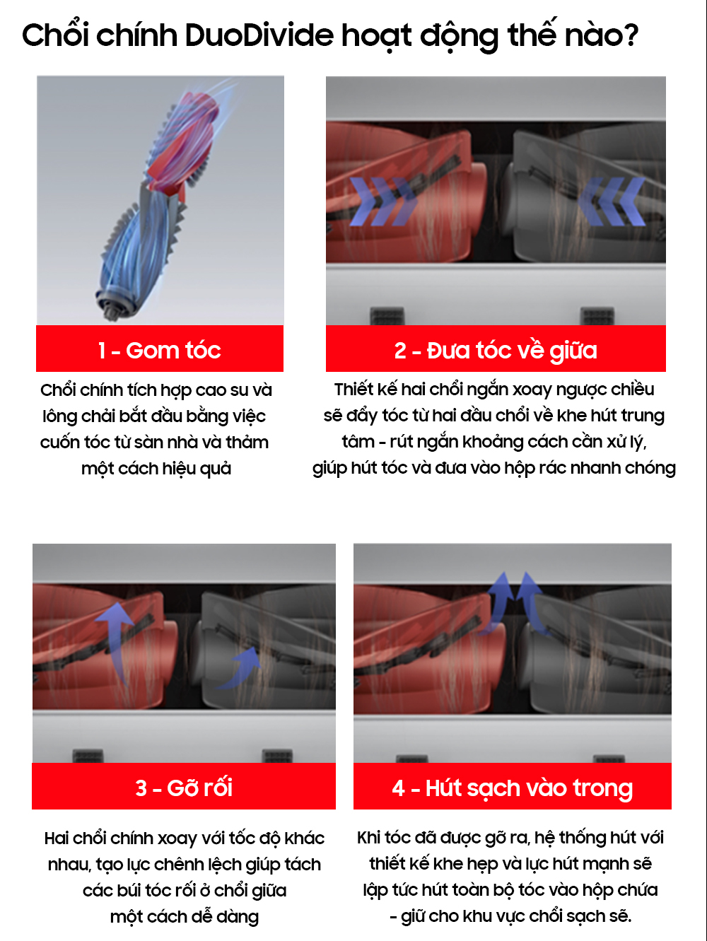 Tóc rối luôn là nỗi ám ảnh của người dùng Robot, với các sản phẩm khác trên thị trường, bạn sẽ phải đi gỡ tóc rất mệt mỏi vì Robot bị kẹt, bị kêu to, thậm chí gãy cả chổi giữa