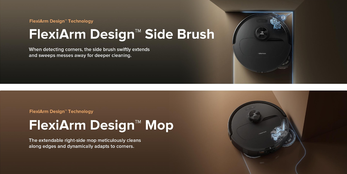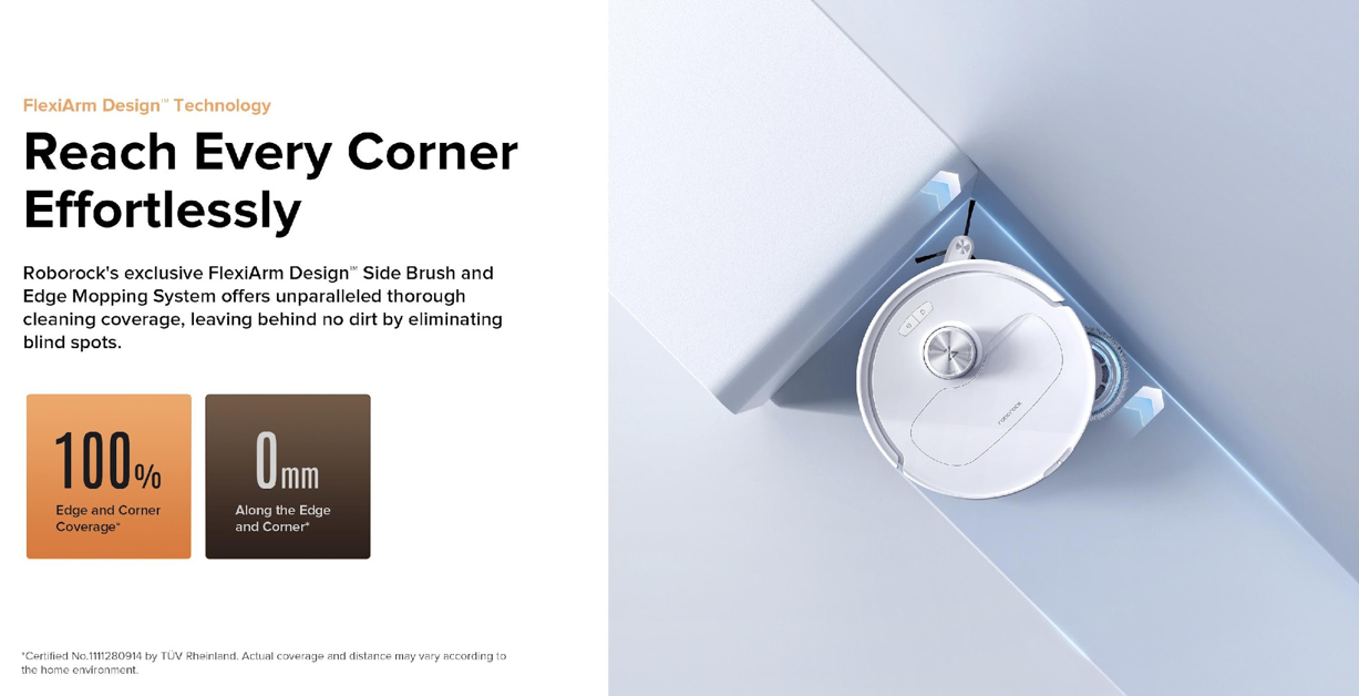 Chổi cạnh và Hệ thống lau góc FlexiArm Design™ độc quyền của Roborock mang đến phạm vi làm sạch kỹ lưỡng vượt trội, không bỏ sót bụi bẩn bằng cách loại bỏ các điểm mù.