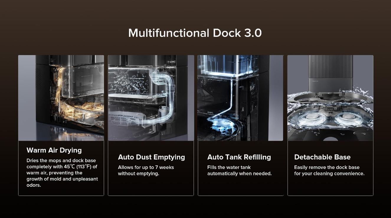Với mô-đun tự làm sạch mới được tích hợp, đáy đế sạc được làm sạch hiệu quả bằng các dụng cụ cạo xoay, loại bỏ nhu cầu bảo trì thủ công.