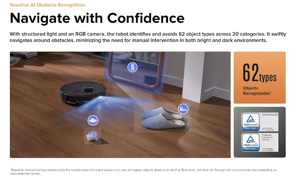 Với ánh sáng có cấu trúc và camera RGB, robot xác định và tránh được 62 loại vật thể thuộc 20 danh mục. Nó nhanh chóng di chuyển xung quanh các chướng ngại vật, giảm thiểu nhu cầu can thiệp thủ công trong cả môi trường sáng và tối.
