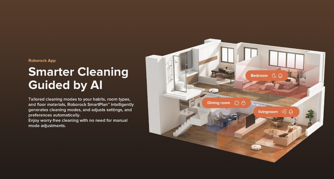 Chế độ làm sạch phù hợp với thói quen, loại phòng, và chất liệu sàn của bạn, Roborock SmartPlan™ thông minh tạo ra chế độ làm sạch, và điều chỉnh cài đặt, và tùy chọn tự động.