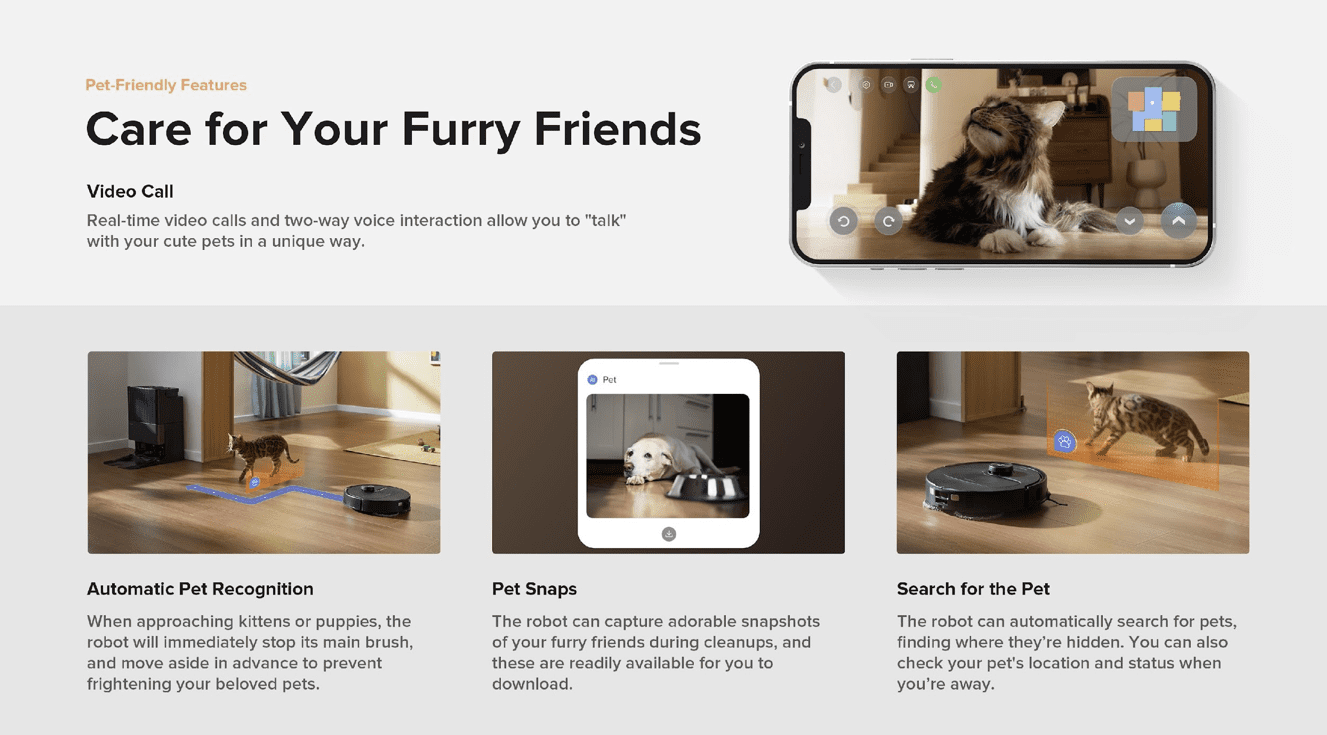 Khi tiếp cận mèo con hoặc chó con, robot sẽ ngay lập tức dừng bàn chải chính và di chuyển sang một bên để tránh làm sợ hãi thú cưng yêu quý của bạn.