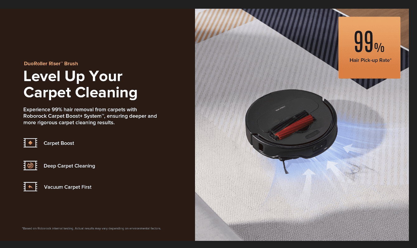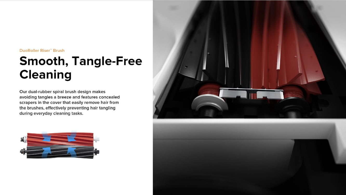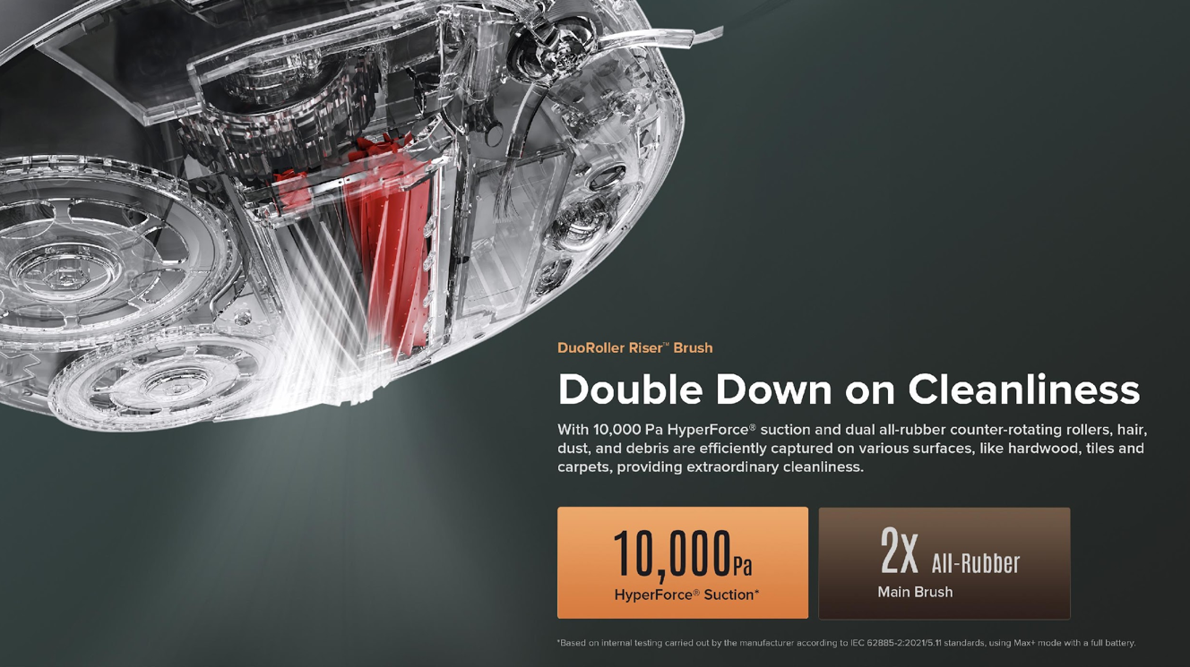 Bàn chải DuoRoller Riser Brush được nâng cấp với hai con lăn cao su, giúp tăng cường hiệu quả làm sạch trên mọi bề mặt. Với lực hút mạnh mẽ lên đến 10.000pa, robot có thể dễ dàng hút sạch bụi bẩn, tóc và lông thú cưng trên sàn cứng và thảm. Chức năng Carpet Boost tự động nhận diện thảm và tăng lực hút tối đa, đảm bảo thảm luôn sạch sâu.