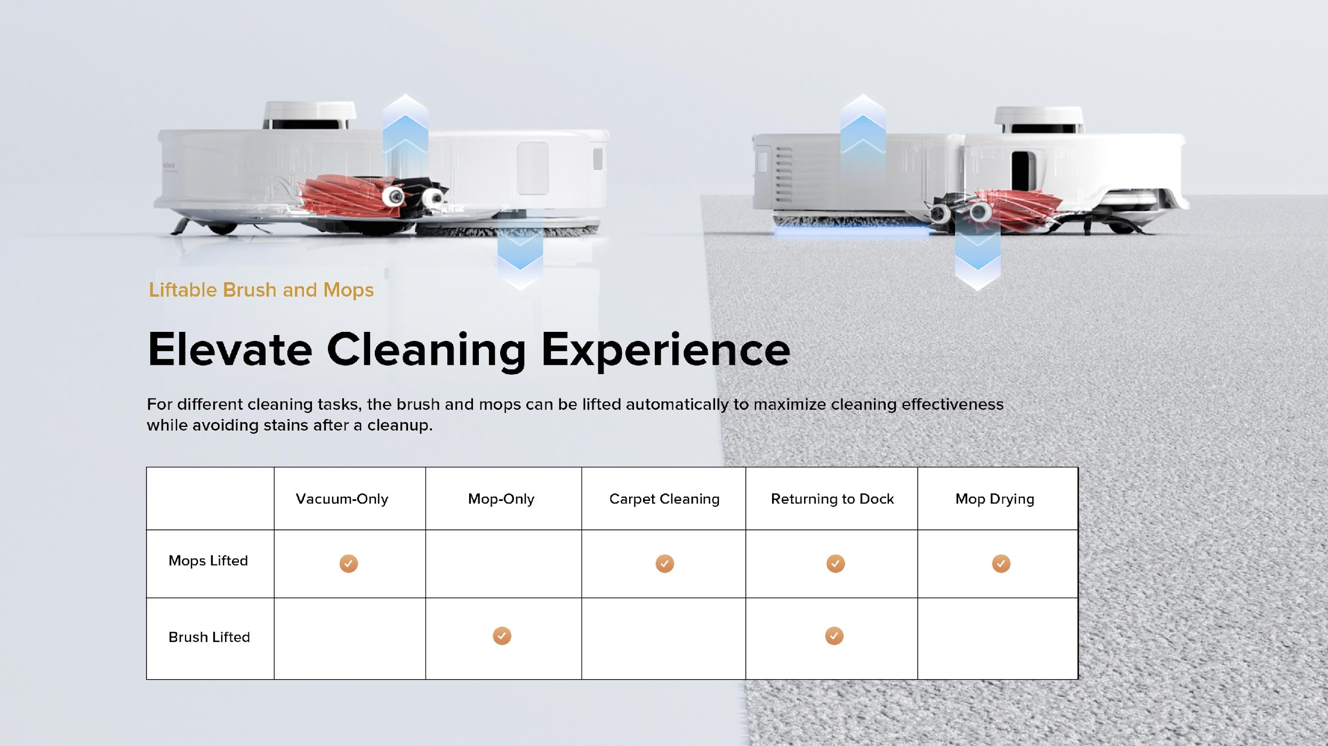 Đối với các công việc làm sạch khác nhau, chỗi giữa và cây lau nhà có thể được tự động nâng lên để tối đa hóa hiệu quả làm sạch đồng thời tránh vết bẩn sau khi dọn dẹp.