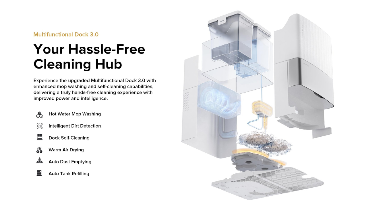 Trải nghiệm Đế sạc đa năng 3.0 được nâng cấp với khả năng giặt khăn lau và tự làm sạch được cải tiến, mang đến trải nghiệm làm sạch thực sự rảnh tay với sức mạnh và trí thông minh được cải thiện.