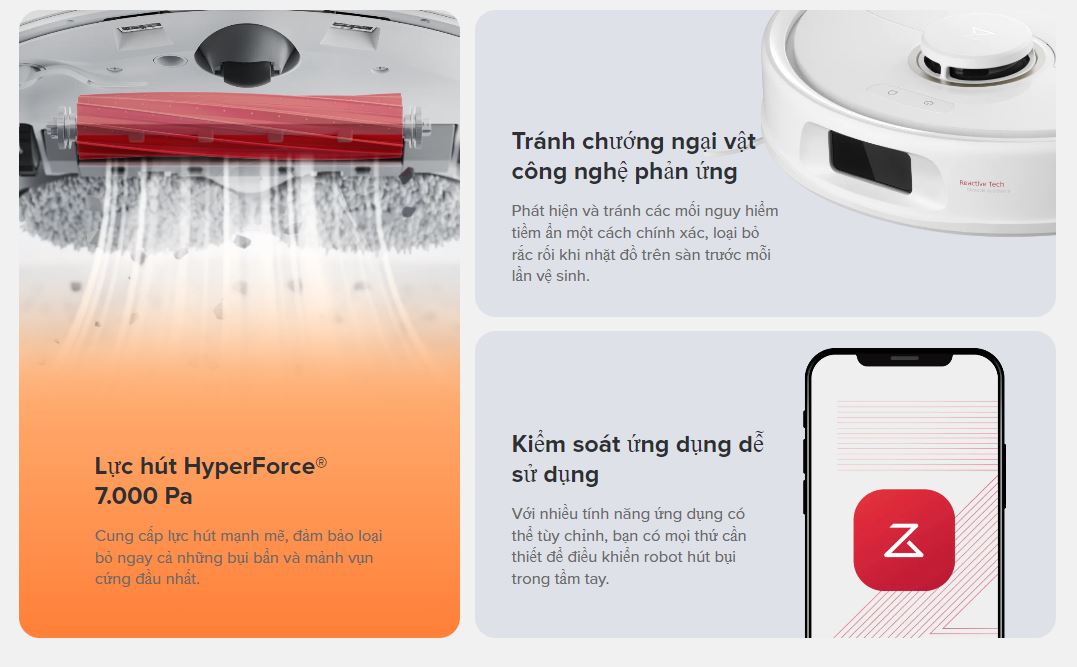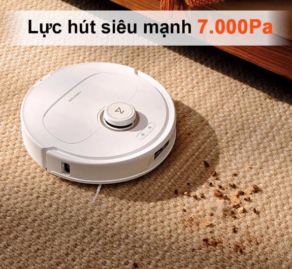 Công suất chân không lớn giúp robot hút sạch bụi bẩn, tóc, lông thú và các loại rác khác một cách hiệu quả. Công suất chân không 7000pa giúp robot hút sạch bụi bẩn, tóc, lông thú và các loại rác khác một cách hiệu quả, kể cả ở những khu vực có nhiều bụi bẩn như thảm, sàn gỗ,...