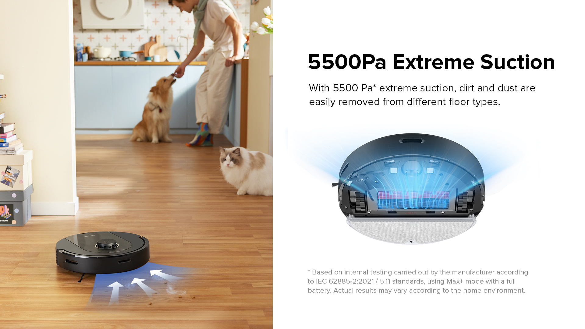 + Lực hút mạnh 5,500Pa: Làm sạch nhanh chóng và hiệu quả