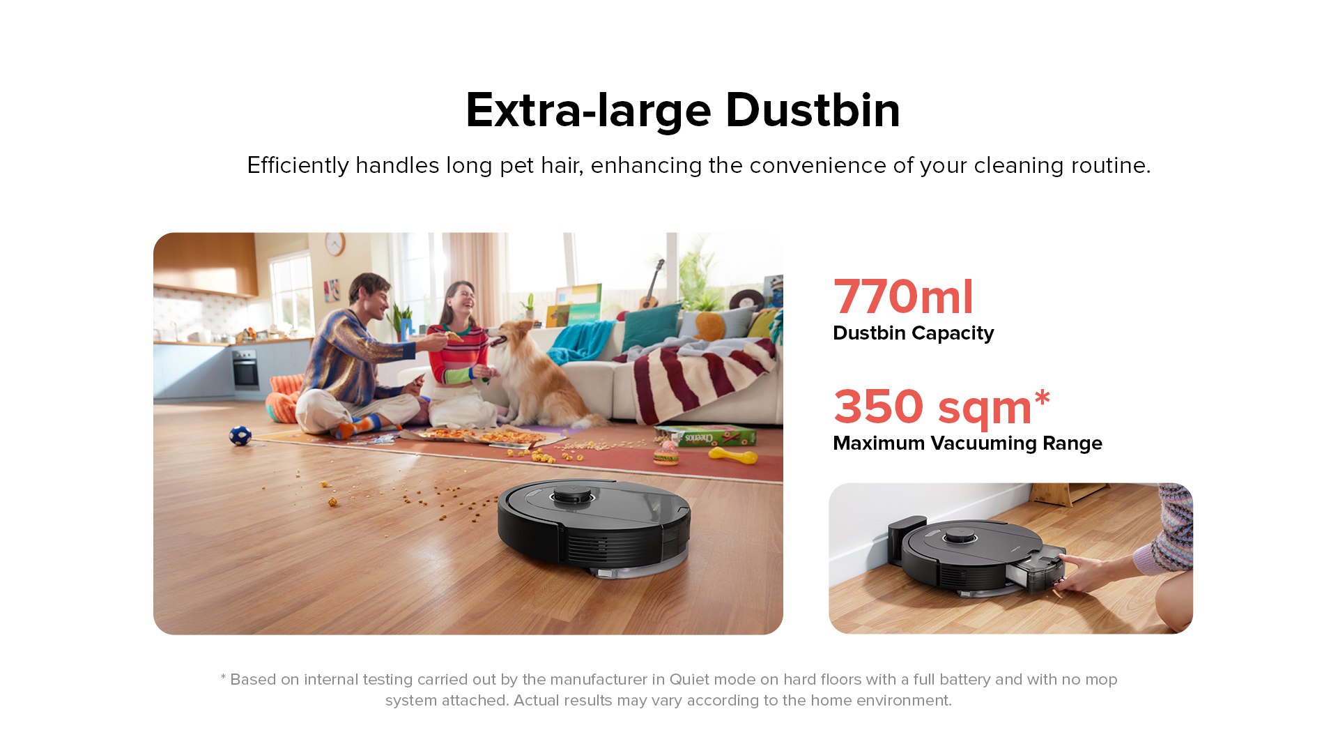 Cùng với đó, sản phẩm với viên pin dung lượng lớn và người dùng có thể cài đặt tính năng sạc ngoài giờ cao điểm thông minh. Sản phẩm có khả năng làm sạch lên tới 350 mét vuông, do đó bạn có thể an tâm hơn trong trường hợp nếu cần dọn dẹp trong diện tích lớn. Bên cạnh đó, thiết bị còn làm sạch được sàn gỗ một cách hiệu quả, di chuyển theo hướng của các đường nối và lọt vào giữa các vết nứt, loại bỏ bụi bẩn bám trên sàn nhà.