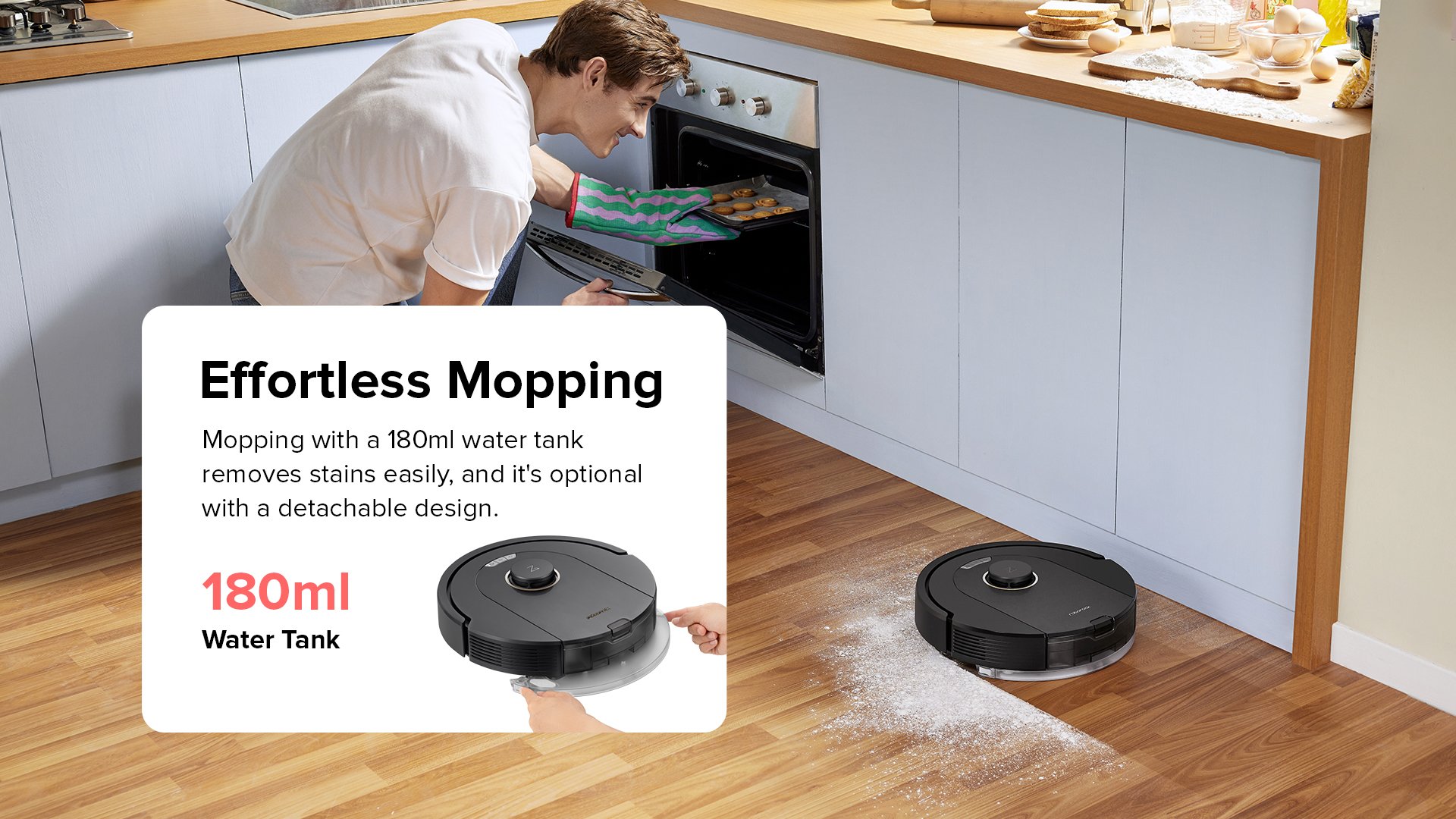 Robot Roborock Q5 Pro được trang bị pin dung lượng lớn nhờ đó thiết bị có thể dọn dẹp được liên tục trong thời gian tới 240 phút. Hộp chứa rác dung tích 770 ml cũng giúp thiết bị có thể dọn dẹp liên tục toàn bộ không gian nhà mà không cần làm rỗng hộp rác giữa chừng. Sản phẩm cũng được trang bị hộp nước 180ml cùng với đó là khăn lau có thể thay thế dễ dàng. Đặc biệt, công nghệ lau rung giúp sản phẩm có thể làm sạch nền nhà một cách sạch sẽ.