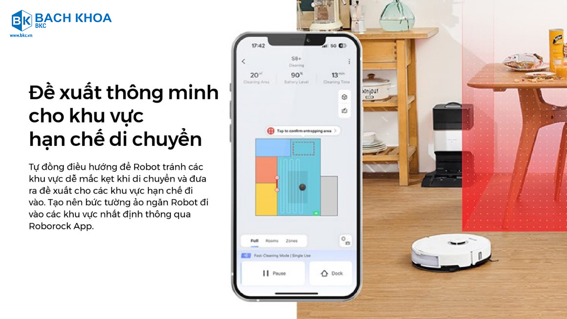 Tự đồng điều hướng để Robot tránh các khu vực dễ mắc kẹt khi di chuyển và đưa ra đề xuất cho các khu vực hạn chế đi vào. Tạo nên bức tường ảo ngăn Robot đi vào các khu vực nhất định thông qua Roborock App.