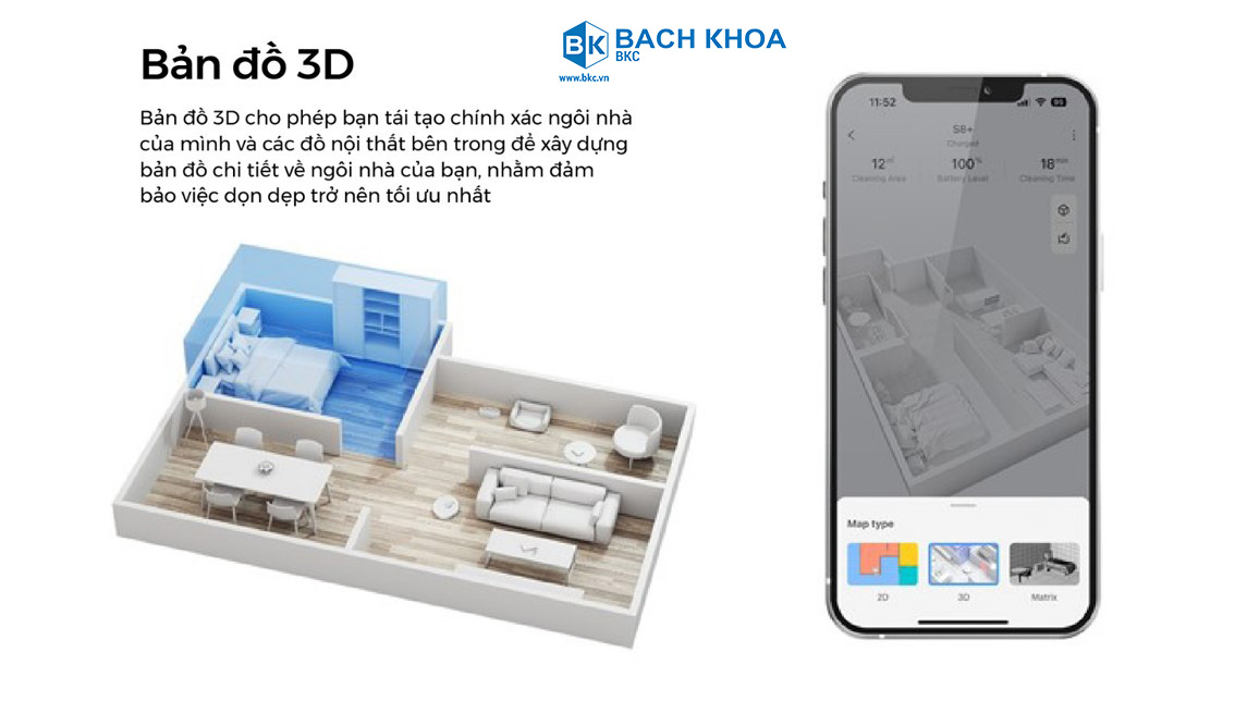 Bản đồ 3D cho phép bạn tái tạo chính xác ngôi nhà của mình và các đồ nội thất bên trong để xây dựng bản đồ chi tiết về ngôi nhà của bạn, nhằm đảm bảo việc dọn dẹp trở nên tối ưu nhất