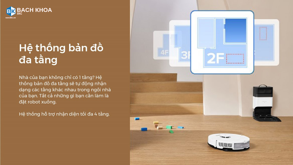 Nhà của bạn không chỉ có 1 tầng? Hệ thống bản đồ đa tầng sẽ tự động nhận dạng các tầng khác nhau trong ngôi nhà của bạn. Tất cả những gì bạn cần làm là đặt robot xuống. Hệ thống hỗ trợ nhận diện tối đa 4 tầng.
