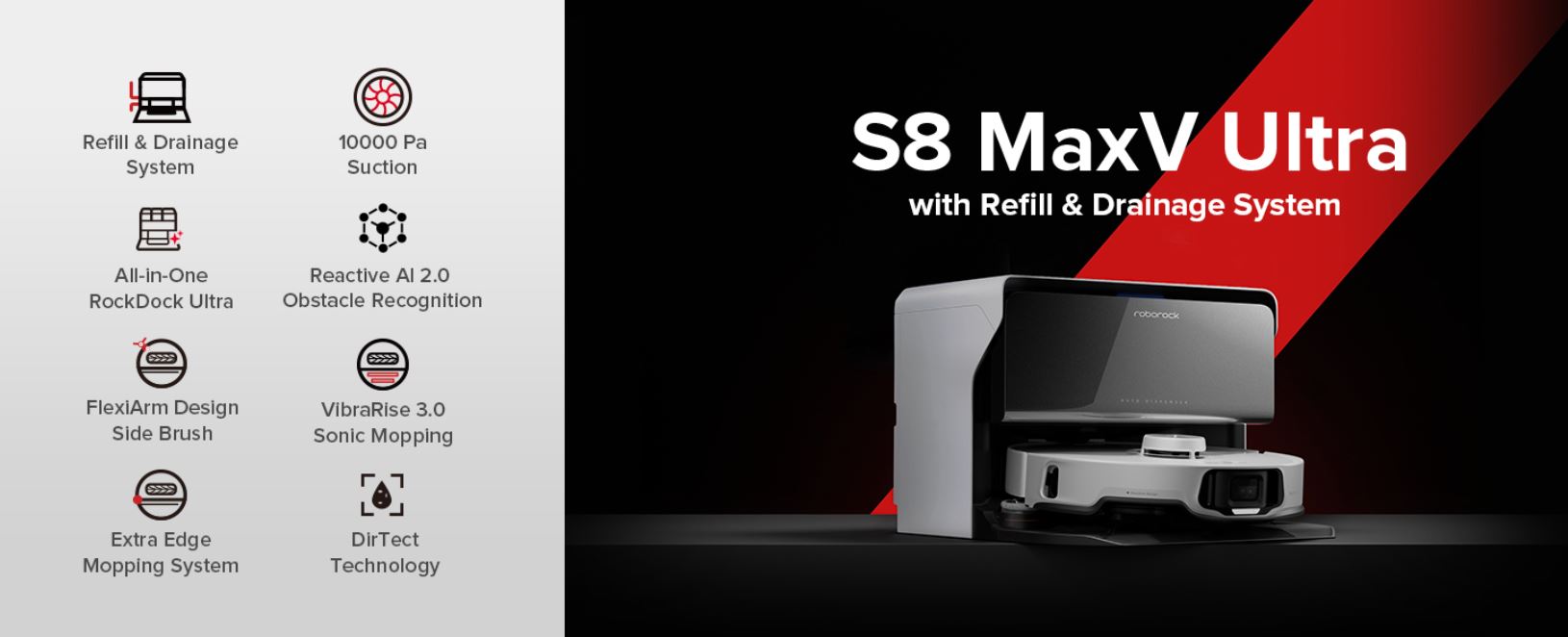 Chổi bên FlexiArm Design: Chỉ có ở Roborock, FlexiArm Design sẽ tự động kéo dài chổi bên khi phát hiện các góc và khu vực thấp bên dưới đồ nội thất, cho phép S8 MaxV Ultra quét sạch bụi bẩn từ những không gian khó tiếp cận.