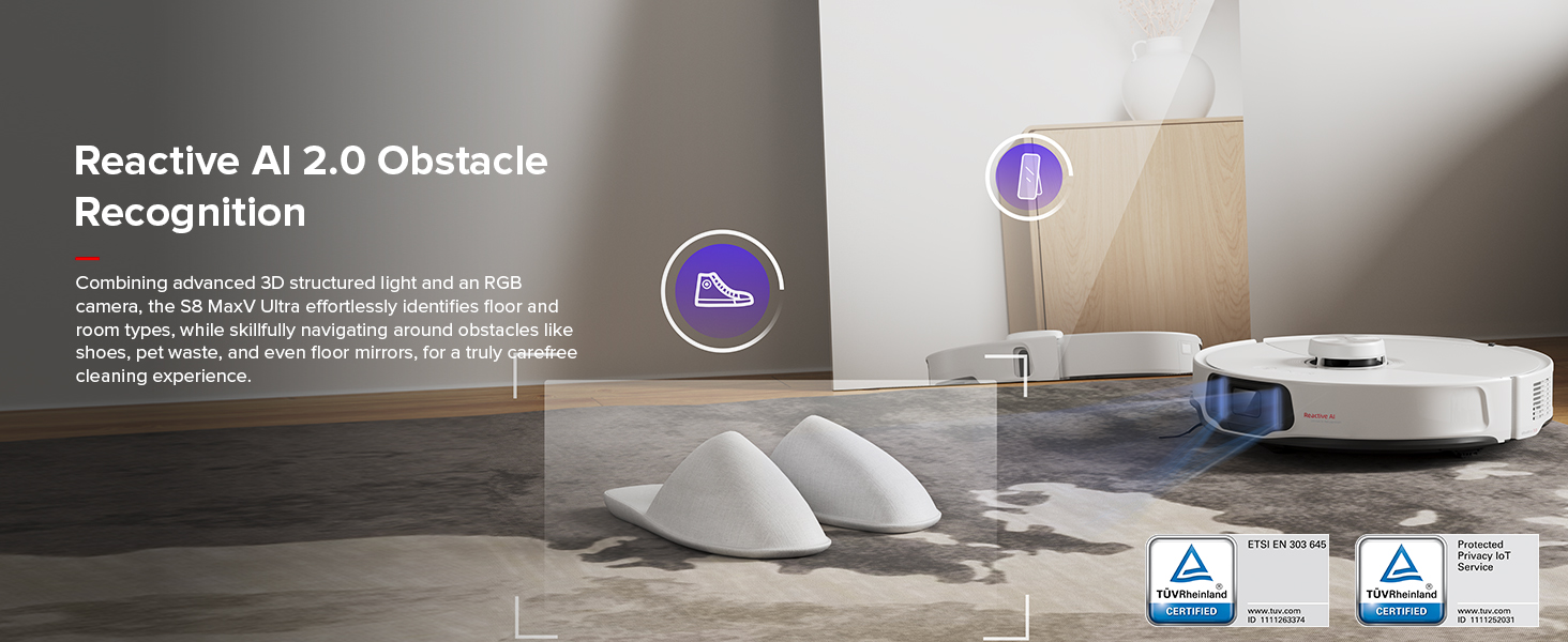 Nhận diện chướng ngại vật bằng AI phản ứng 2.0: Kết hợp ánh sáng có cấu trúc 3D tiên tiến và camera RGB, S8 MaxV Ultra dễ dàng xác định loại sàn và phòng, đồng thời khéo léo di chuyển tránh chướng ngại vật như giày dép, chất thải vật nuôi và thậm chí cả gương trên sàn, mang đến trải nghiệm vệ sinh thực sự vô tư.
