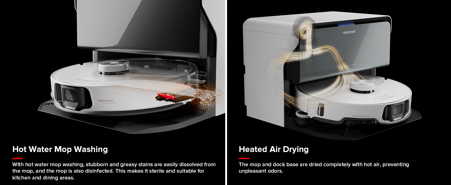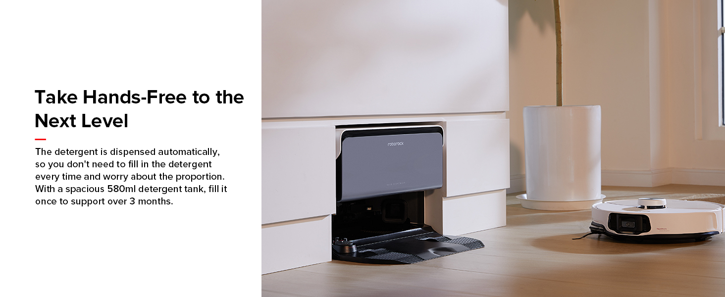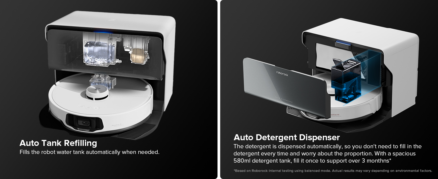 Roborock S8 MaxV Ultra Auto đa năng: Với chức năng giặt nước nóng, các vết bẩn cứng đầu và dầu mỡ dễ dàng hòa tan khỏi cây lau nhà. Chất tẩy rửa được phân phối tự động, do đó bạn không cần phải đổ chất tẩy rửa mỗi lần và lo lắng về tỷ lệ. Với bình chứa chất tẩy rửa rộng rãi 580ml, chỉ cần đổ một lần để sử dụng trong hơn 3 tháng. Cây lau nhà và đế dock cũng được sấy khô hoàn toàn bằng khí nóng, ngăn ngừa mùi khó chịu. Hỗ trợ tự động đổ bụi sau khi vệ sinh và trong khi vệ sinh. Nhờ chức năng Tự động đổ đầy bình, nó sẽ tự động đổ đầy bình nước của robot khi cần.