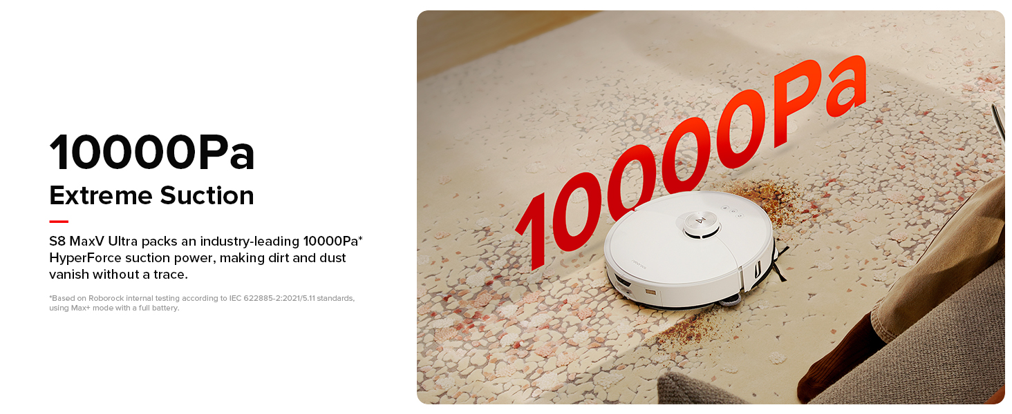 Lực hút 10000Pa với chổi DuoRoller Riser: S8 MaxV Ultra sở hữu lực hút HyperForce 10000Pa hàng đầu trong ngành, giúp bụi bẩn biến mất không dấu vết. Đạt hiệu quả hút bụi cao hơn trên mọi loại sàn và đảm bảo ít tóc rối hơn nhờ sức mạnh của chổi con lăn kép, được thiết kế để có môi trường sạch hơn, không rắc rối.