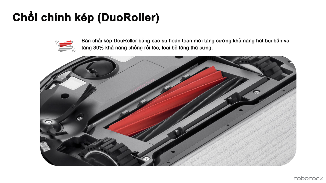 Robot hút bụi lau nhà Roborock S8 Plus được trang bị bàn chải DuoRoller kép bằng cao su hoàn toàn mới, giúp tăng cường khả năng hút bụi và đưa tầm khả năng làm sạch rãnh lên tầm cao mới. Do đó, việc sử dụng robot trên tấm gỗ hay thảm đều dễ dàng cuốn trôi mọi bụi bẩn, thậm chí là tóc.