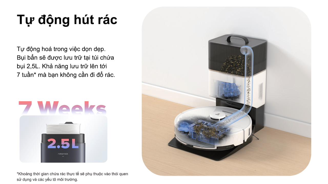Đặc biệt, Roborock S8 Plus có hộp lưu rác với kích thước khổng lồ 2.5L được đặt bên cạnh động cơ của robot. Điều đó có nghĩa là bạn sẽ không cần phải đi đổ rác trong vòng 11 tuần mà chính nó sẽ tự thực hiện và bạn không cần động chạm gì đến nữa.