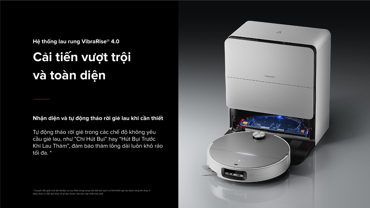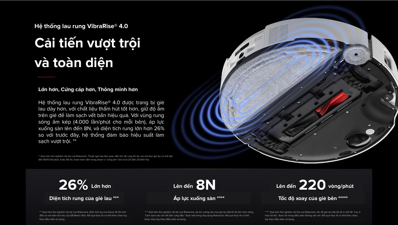 - Hệ thống Giẻ lau VibraRise 4.0 với chế độ lau sóng âm kép 4.000 lần/phút và 4 vùng rung riêng biệt
