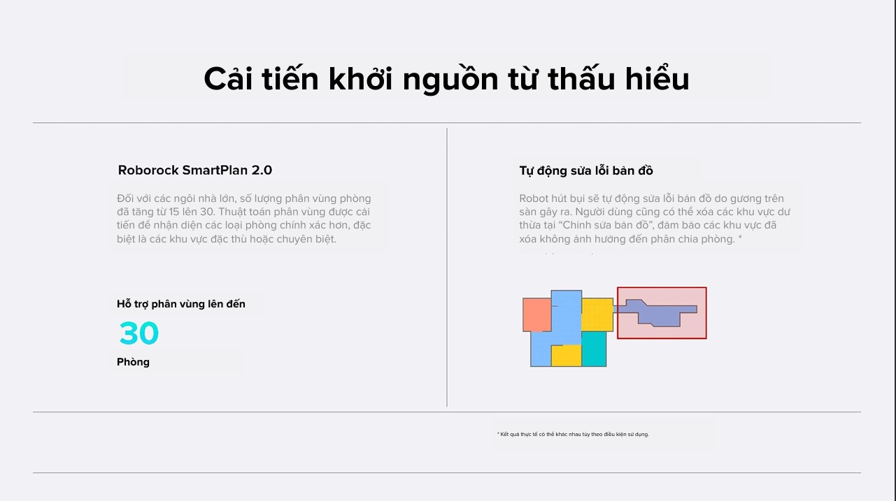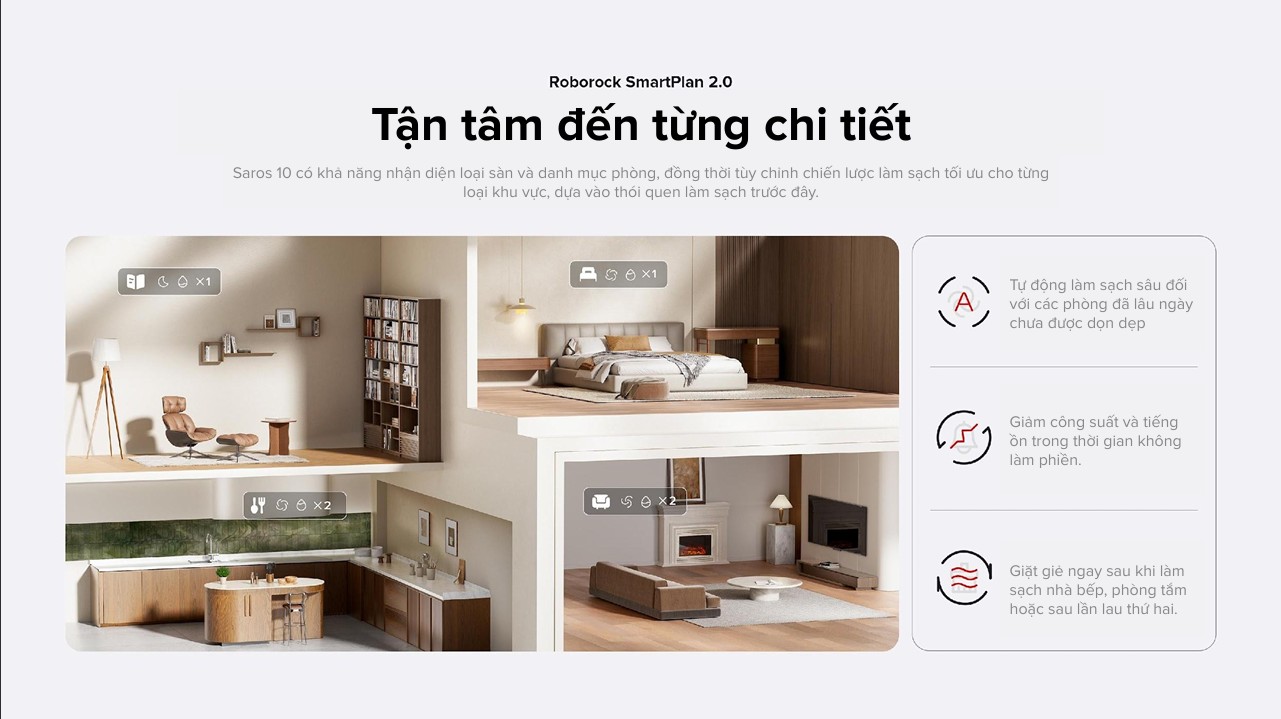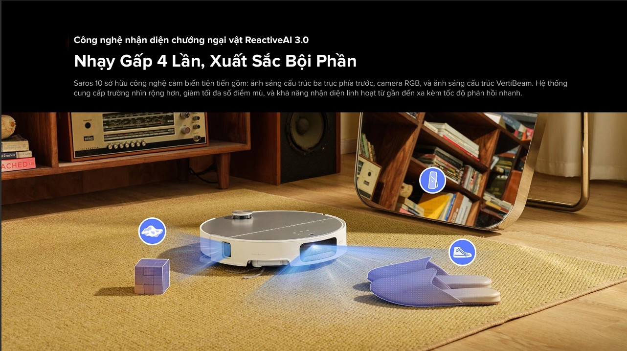 - Sử dụng công nghệ Reactive AI 3.0 nhận dạng đến 108 loại chướng ngại vật kể cả nội thất đặc thù và dây điện