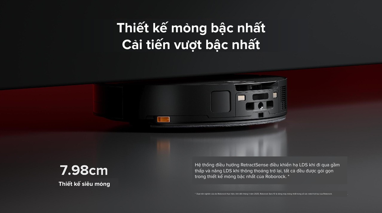 Thiết kế đột phá với độ mỏng ấn tượng Roborock Saro 10 được thiết kế siêu mỏng, là dòng robot hút bụi mỏng nhất của Roborock tính đến tháng 1/2025. Hệ thống RetractSense tự động điều chỉnh cảm biến LDS khi di chuyển qua các khu vực gầm thấp.