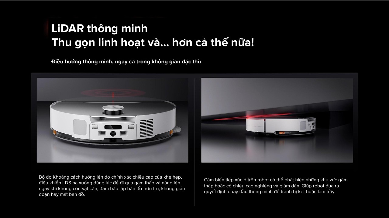 - Thiết kế siêu mỏng 7.98cm, giúp robot dễ dàng luồn lách vào những vị trí thấp và khó tiếp cận