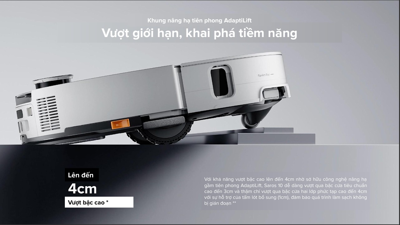 Roborock Saros 10 sở hữu lực hút mạnh mẽ lên đến 22.000 Pa, thiết kế siêu mỏng dễ dàng len lỏi mọi ngóc ngách để làm sạch. Với sự nâng cấp công nghệ điều hướng 360° và công nghệ nhận diện chướng ngại vật 3.0